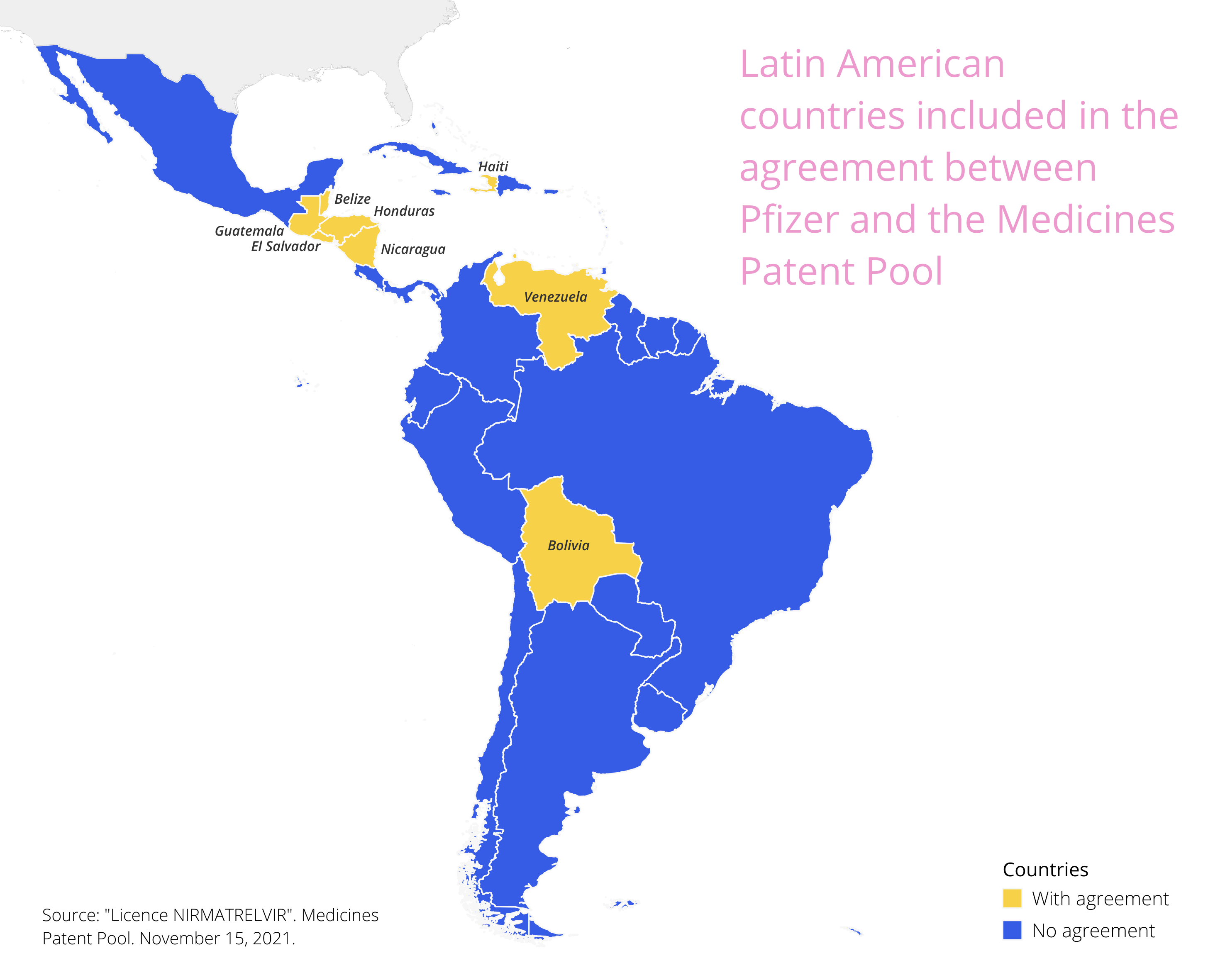 In November 2021, Pfizer granted 35 voluntary licenses for Paxlovid through the Medicines Patent Pool. The Latin American countries where the distribution of the generic has been authorized are Belize, Bolivia, El Salvador, Guatemala, Haiti, Honduras, Nicaragua, and Venezuela. Pfizer has filed patents in excluded countries until 2041, making it impossible for them to acquire the Active Pharmaceutical Ingredient (API) to manufacture the product or its generic version cheaply. The companies producing the generic are located in 12 countries, with only 3 in Latin America: Neolpharma (Mexico), Magnachem (Dominican Republic), and Nortec Química (Brazil). Neolpharma produces generic drugs in Mexico, but the Ministry of Health had to purchase 300,000 patent treatment courses because Mexico is not included in countries with voluntary MPP licenses. If we consider that a course of treatment costs $530 in the US, we could be talking about US$159 million.