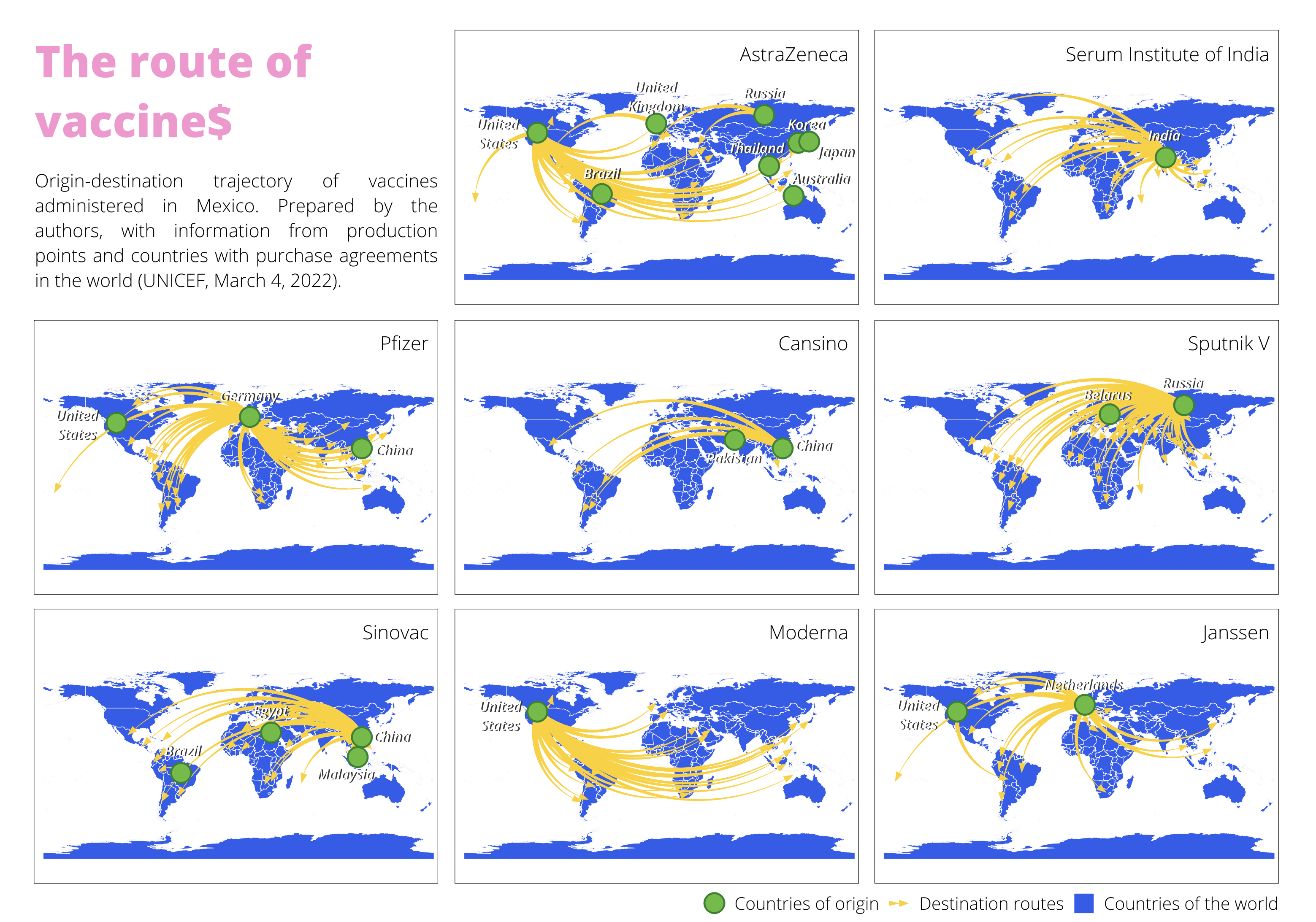 The Route of Vaccines is a cartographic representation of the purchase agreements entered into by the pharmaceutical companies that produce the vaccines that have been administered in Mexico. These 8 companies have sold 9.2 billion doses worldwide. Pfizer is the company with the most doses sold in the group (3.366 billion doses in 100 contracts with 55 countries). It is followed by Serum Institute of India (2.135 billion doses in 40 contracts with 31 countries), AstraZeneca (1.256 billion doses in 36 contracts with 33 countries), and Moderna (1.036 billion doses in 33 contracts with 22 countries). Pfizer, AstraZeneca, Moderna, and Janssen have their primary destination in the United States, whereas Serum Institute of India has India; Sinovac has China; Sputnik V has Iran, in addition to Russia; and Cansino has Mexico. Pfizer, Moderna, and Janssen have sent more than 60% of their total doses to the United States, Canada, and Europe. Sinovac and Sputnik V have sent at least half their doses to Asia and AstraZeneca has sent a third of its doses to Asia and a third to Latin America as its leading destinations. Latin America has received 1.326 billion doses from these 8 companies. Eighteen countries have purchase agreement with the companies, the top destinations being Brazil, Mexico, and Peru; Brazil has acquired nearly half of these doses. The pharmaceutical companies with most doses sold in the region are Pfizer, AstraZeneca, and Sinovac.
